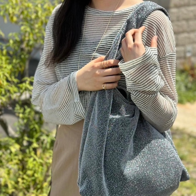 細やかなラメ感が印象的なバッグ。 持つだけで華やかな印象になり、 お出かけ用にもピッタリです! メインバッグにはもちろん、 サブバッグとしても活躍します♪ 【サイズ】H300×W340-440×D130mm 持ち手立ち上り:200mm 【素材】ポリエステル100% ※ お客様がご覧になっておりますモニターや環境により、実際の色味と多少異なって見える場合がございます。予めご了承ください。 トートバッグ A4サイズ 肩がけ プチプラ 軽量 おしゃれ ラメ キラキラ